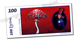 16.04.2008 - Lord Puss de Blum, der Lichtminister des LichtImperiums, gibt bekannt, dass die Produktion der Lichtillionen begonnen hat. Die Erste "100er"-Lichtillion ist fertig. Der Künstler Jochen Wojtas, der die Lichtillionen alle als Unikate für das LichtImperium malt (auf Vordrucke), hat an seinem Geburtstag, dem 15. April 2008, den ersten Lichtillionen-Schein erschaffen.